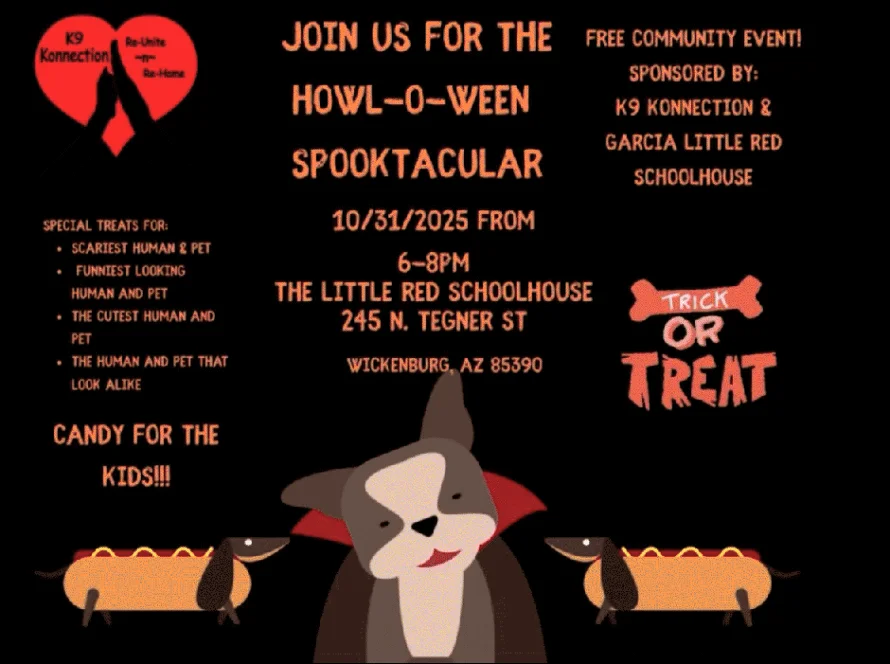 Get ready for a paw-some night of spooky fun! 🐾 Join K-9 Konnection Rescue for the Howl-O-Ween Spooktacular — a free community event happening Thursday, October 31, from 6–8 PM at Garcia’s Little Red Schoolhouse (245 N. Tanner St., Wickenburg).