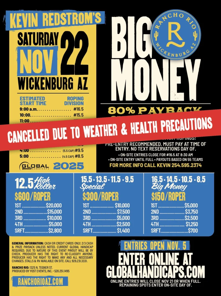 This temporary pause is intended to safeguard the equine athletes that sustain the entire winter roping season. Additional updates will be shared as needed.